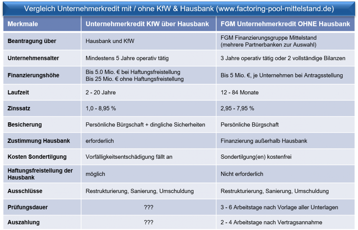 Der Unternehmerkredit Online ist die alternative und günstige Finanzierung für KMU und Mittelstand mit einem Darlehensbedarf bis 1.5 Mio. €. Im Vergleich zum KfW-Unternehmerkredit müssen weder dingliche Sicherheiten gestellt werden, noch ist eine Zustimmung der Hausbank erforderlich.